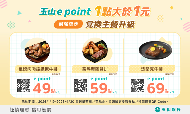 玉山e point 放大優惠 活動期間:2026/1/19-2026/4/30 玉山e point 1點大於1元,兌換「主餐升級」限時優惠! 活動期間至【玉山銀行信用卡點數專區】兌換優惠票券: 49點e point 兌換主餐升級 重磅肉肉控鐵板牛排,兌換連結https://esun.co/tas01 59點e point 兌換主餐升級 霸氣海陸雙拼,兌換連結https://esun.co/tas02 69點e point 兌換主餐升級 法蘭克牛排,兌換連結https://esun.co/tas03 ◎瞭解更多與活動詳情請見玉山銀行官網或掃描QR code
